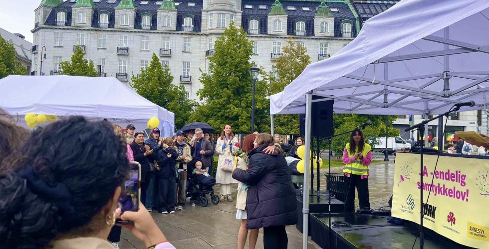 Mange møtte opp til å markere FNs Internasjonale dag for avskaffelse av vold mot kvinner foran Stortinget.