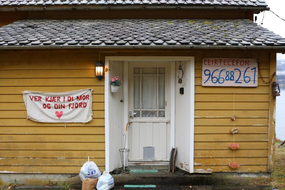 I det man nærmer seg bygda ser man bannere, campingvogner, låver og bratte steinvegger hvor budskap som “la fjorden leve”, og “dritt skal i do, ikke fjorden” står skrevet i store versaler.