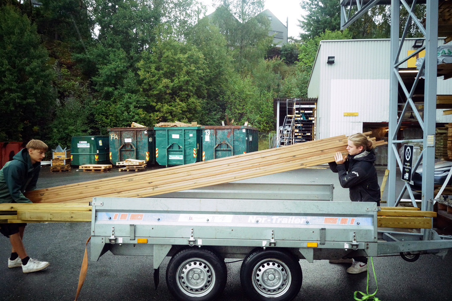 Med hengeren på slep parkerer Nils varebilen ved byggevarehandelen. Handlelisten har han memorert, og de unge snekkerne setter øyeblikkelig i gang med plukking av materialer. Først finner de fram konstruksjonsvirke til bjelkelaget. Deretter velger de nøye ut de fineste terrassebordene. De skal nemlig bygge platting på Nesodden, og da er det viktig at terrassedekket ser bra ut.
