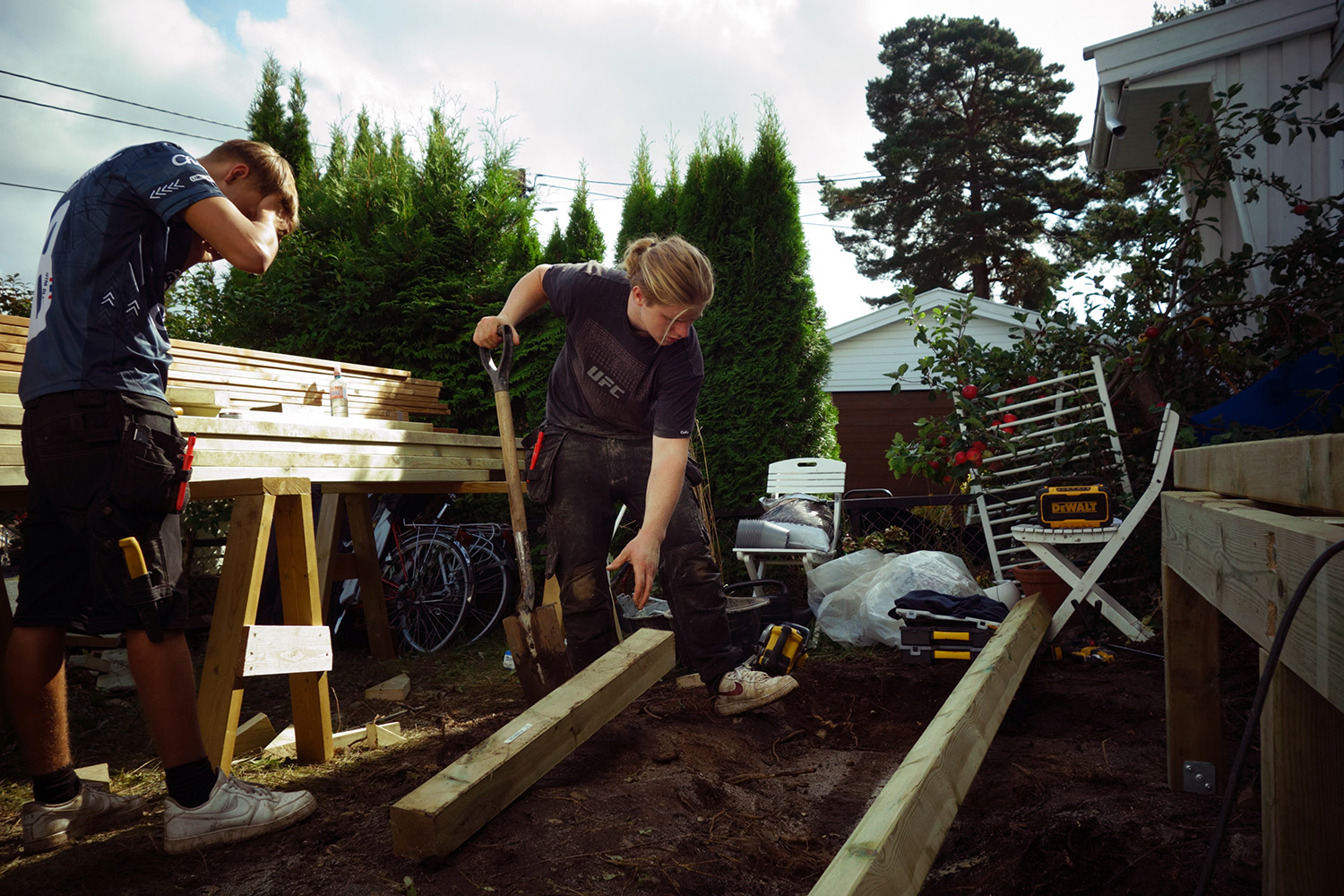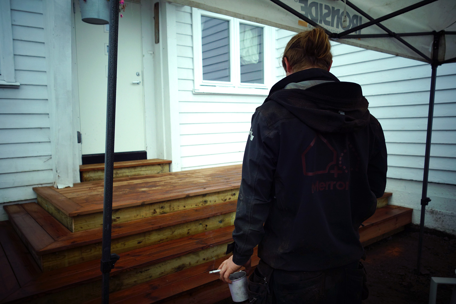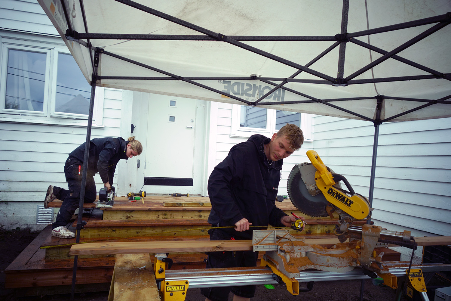 Nils og David gjør siste innspurt med å legge terrassebordene, og kunden som har bestilt prosjektet kommer ut av ytterdøren.