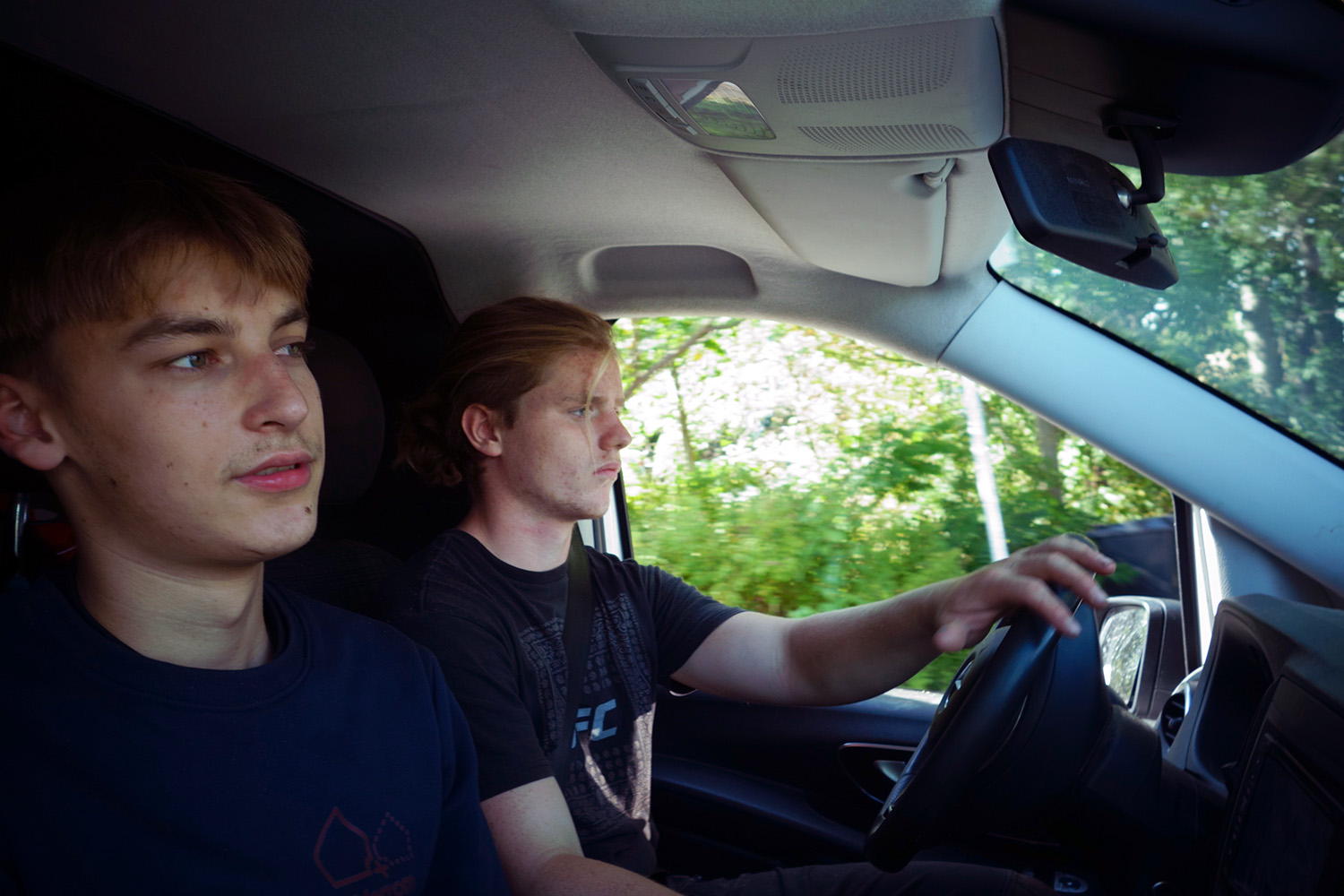 På veien til byggevarehandelen har Nils plukket opp sin venn og kollega, Kurt Brakss (21). Kurt jobber fulltid hos Nils, noe han har gjort i et år nå.