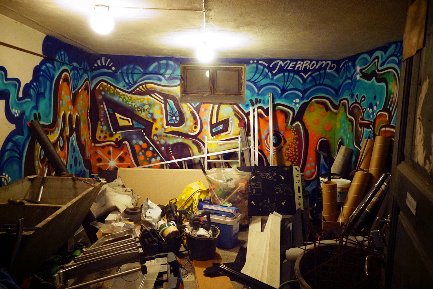 Lageret er mørkt og slitt, og bærer preg av korte og travle stopp innom. På veggen bak det tilsynelatende uorganiserte utstyret, er det malt en stor graffiti-piece som understreker bedriftens ungdommelighet. «Merrom» står det i fargerike og detaljfulle bokstaver. Nils forteller at to av hans venner, som også jobber hos ham, har malt veggen.