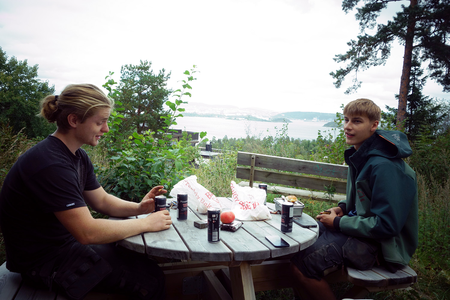 Nå er klokken halvt ett, og det er tid for lunsj. Etter et kjapt stopp innom den lokale dagligvarebutikken for å kjøpe brød og energidrikk, har de funnet seg en utsiktsbenk bak en garasje like ved byggeplassen.