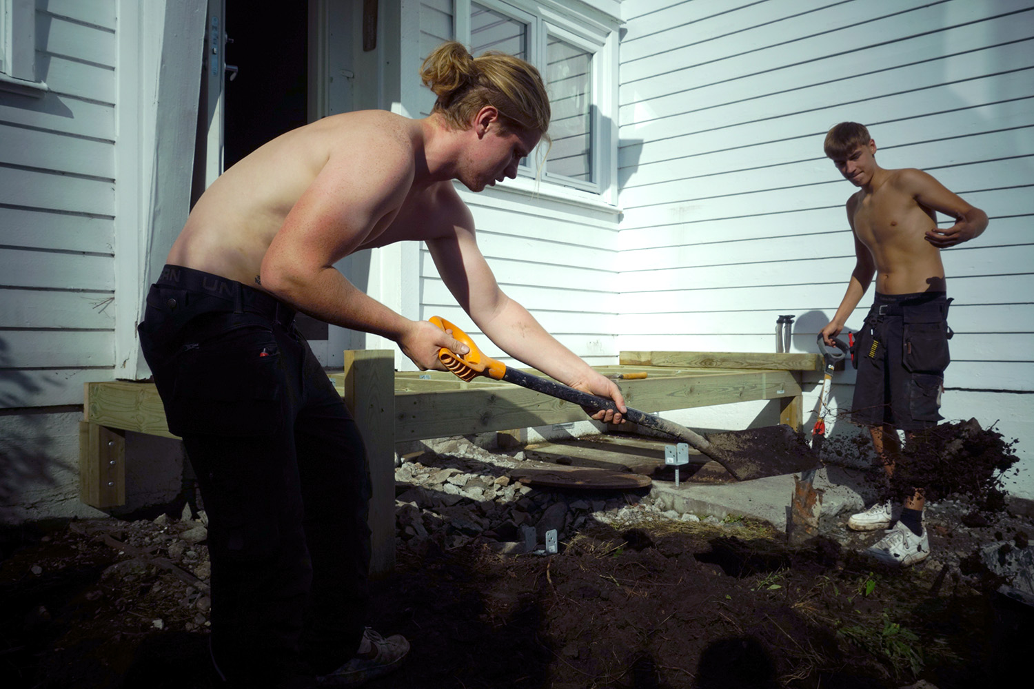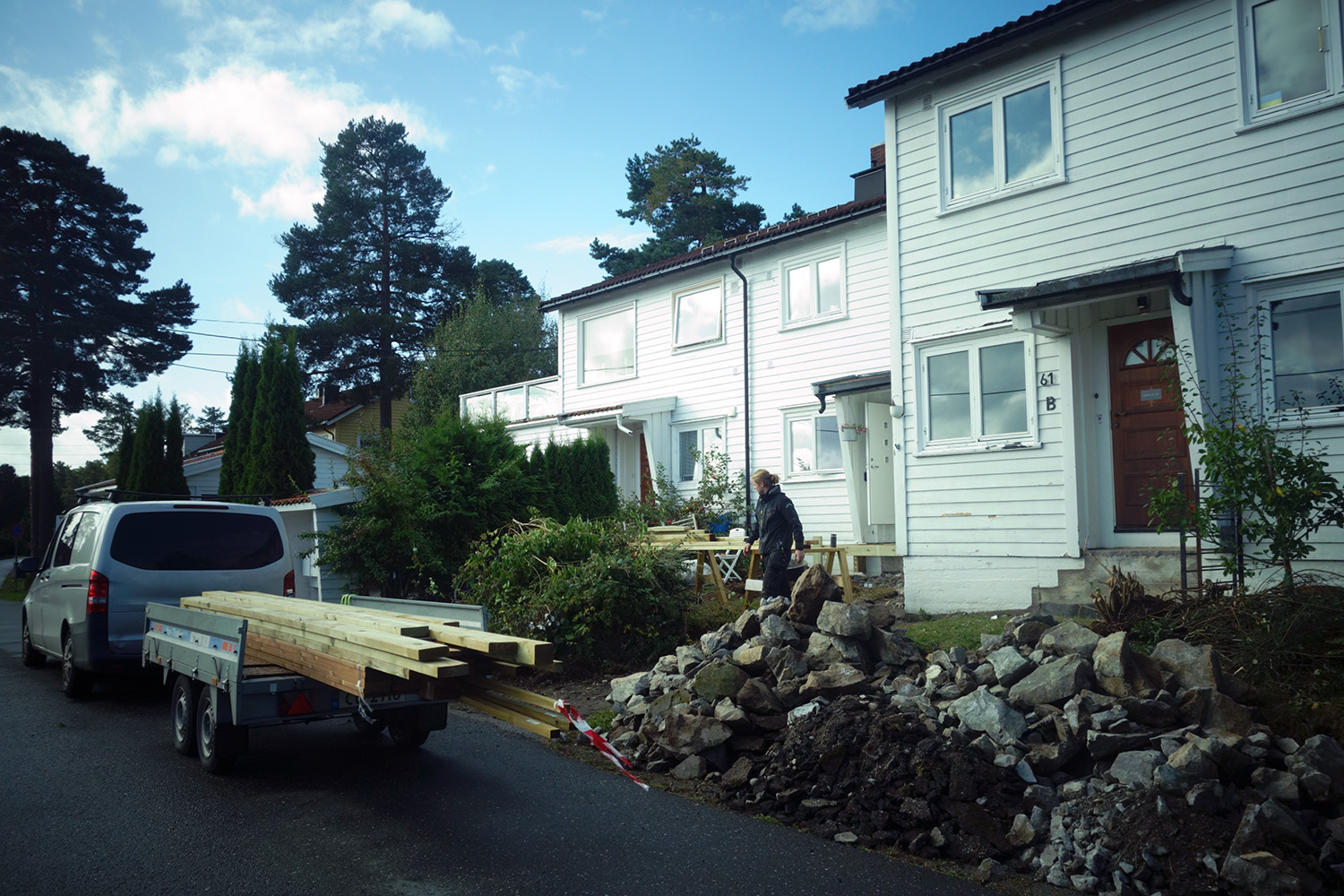 I et nabolag på Nesodden ligger det et hvitt rekkehus. Huset mangler trapp opp til inngangsdøren, og på den opprevede plenen ligger det dunger med stein, jord og kvister. Her skal de bygge platting, legge plen og lage en sti av skifer opp til inngangspartiet.