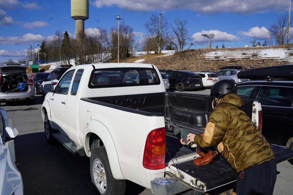 Til tross for "overtråkket" var det en bil som passet henne godt. Bak førersetet lå det slalåm-sko og annet utstyr som er viktig når man skal utøve diverse idretter. Skiene lå godt plassert langs med lasteplanet.