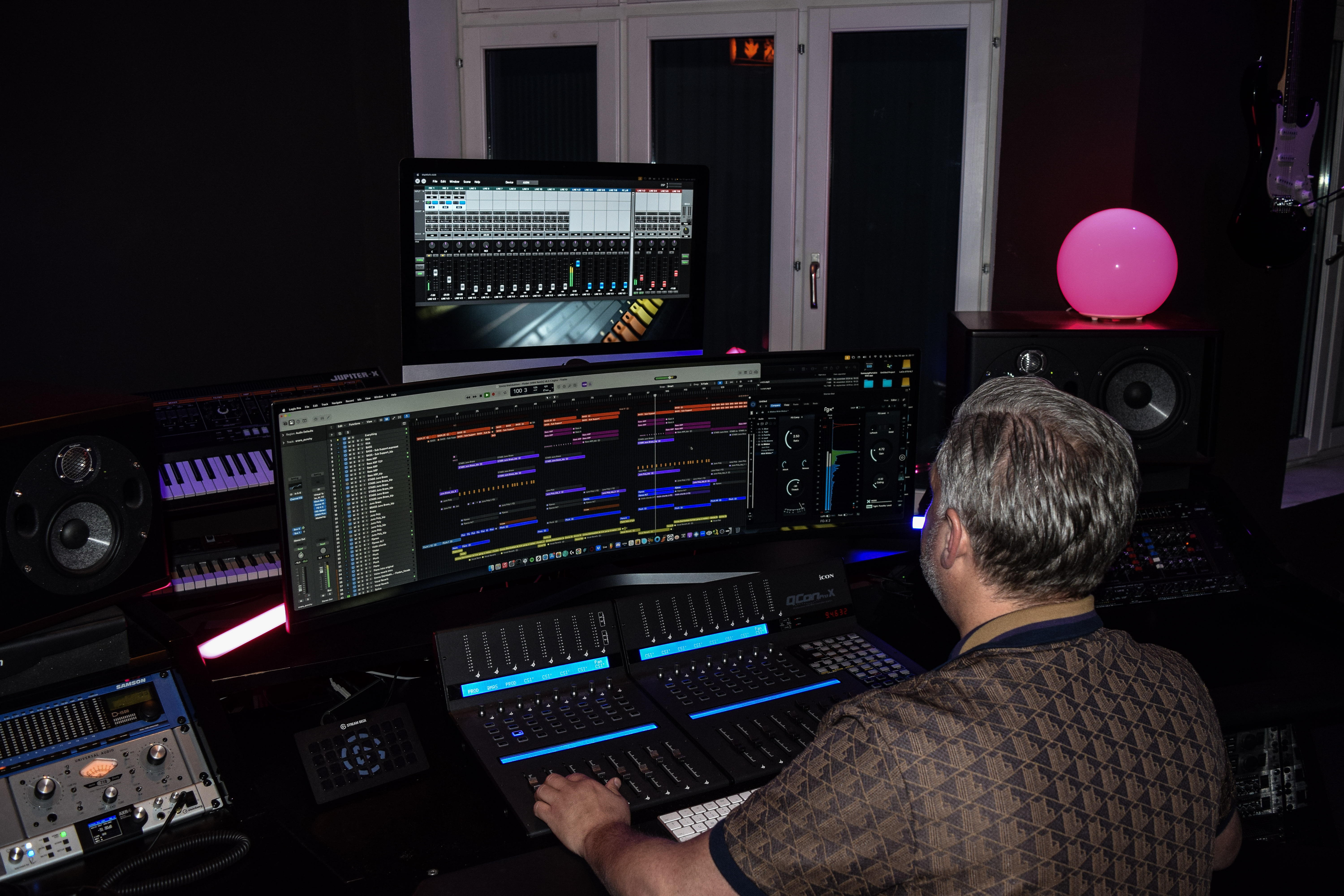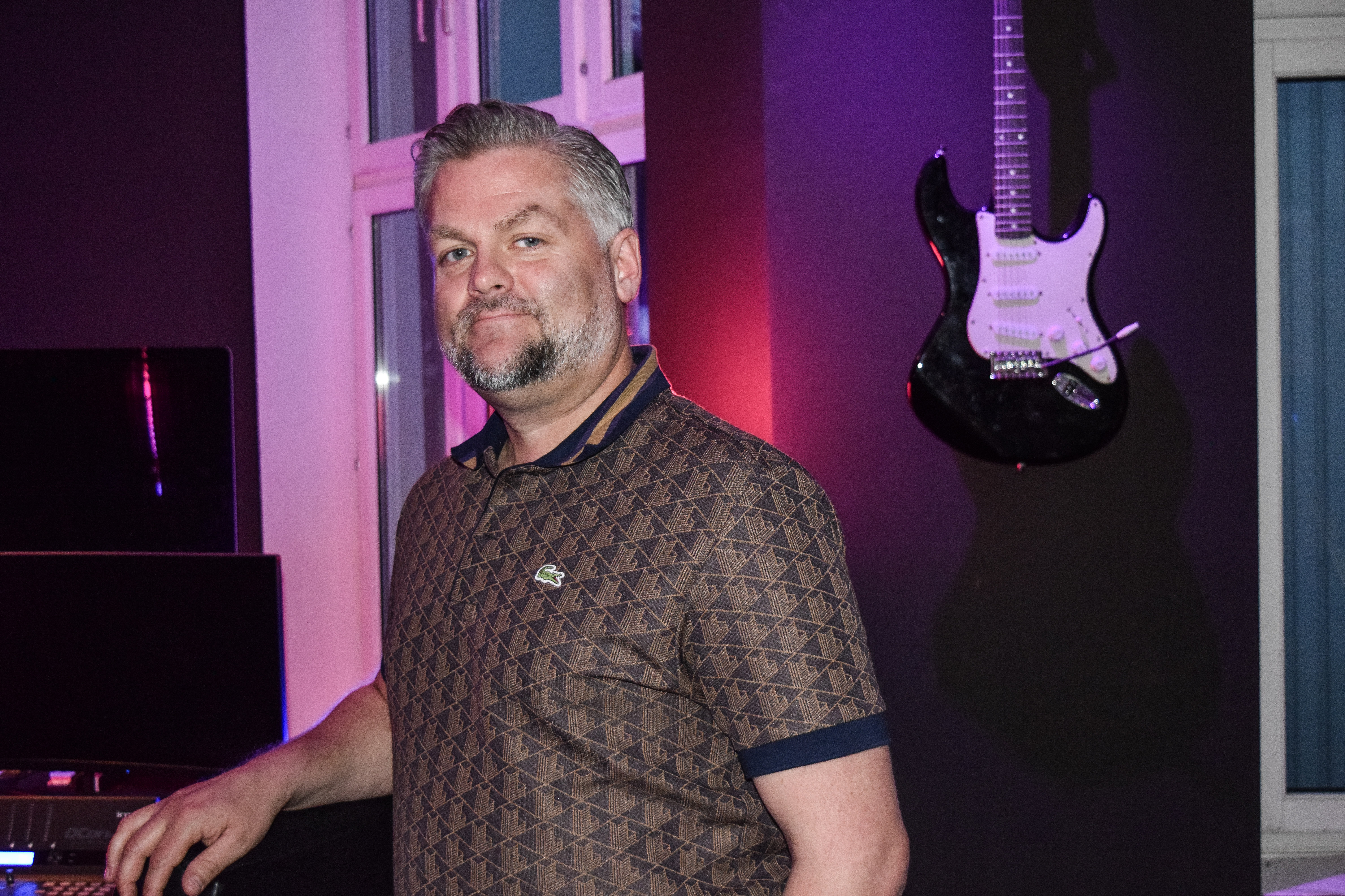 I hjørnet, bak et miksebord og en pc, står en som elsker jobben sin.