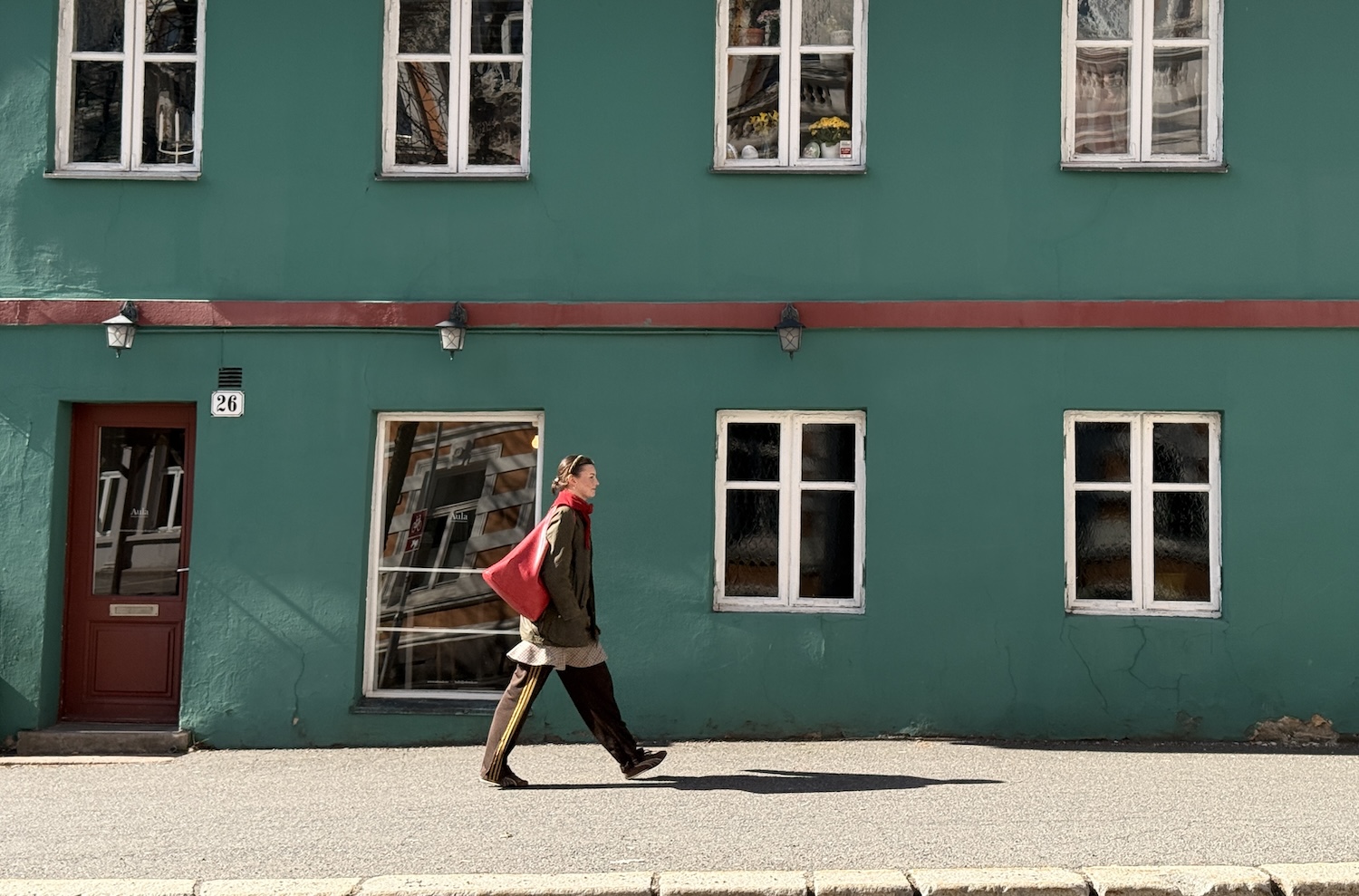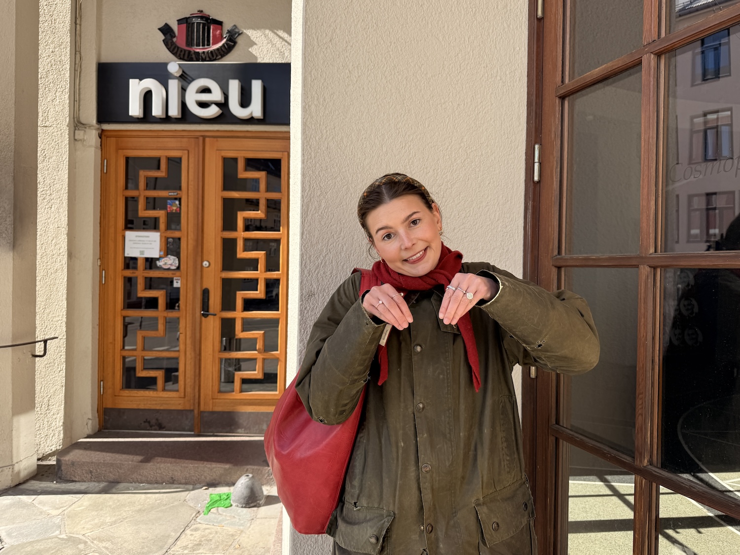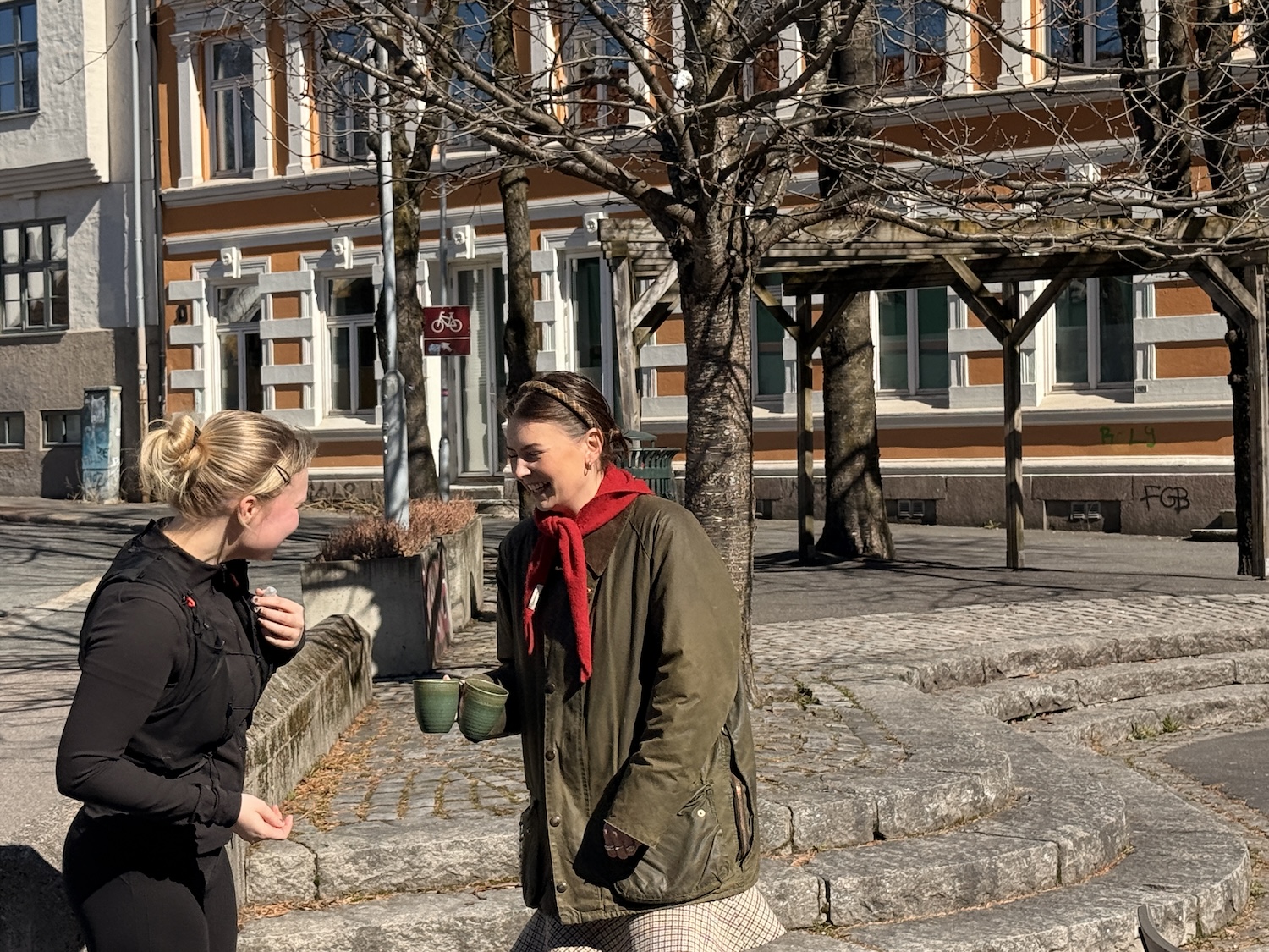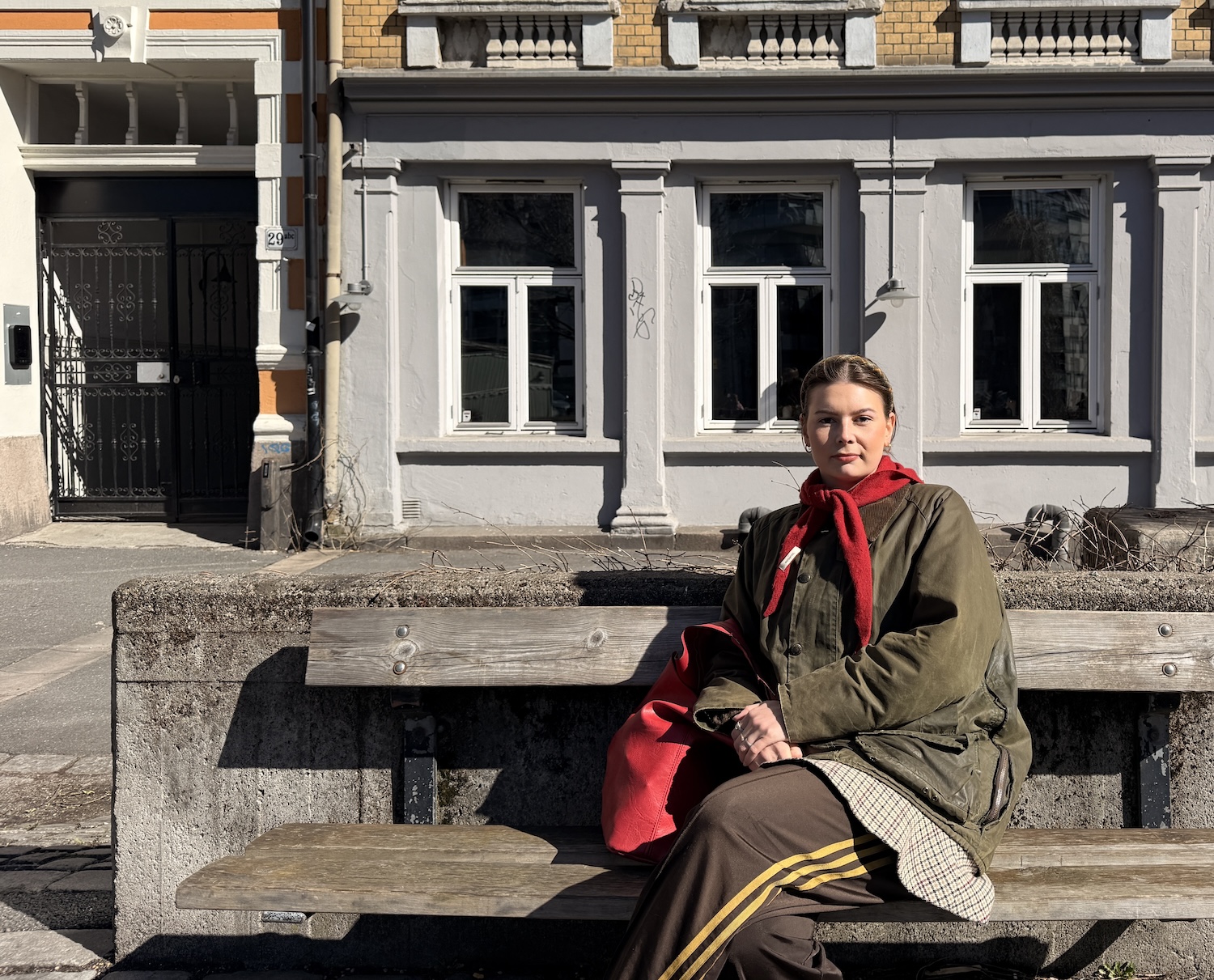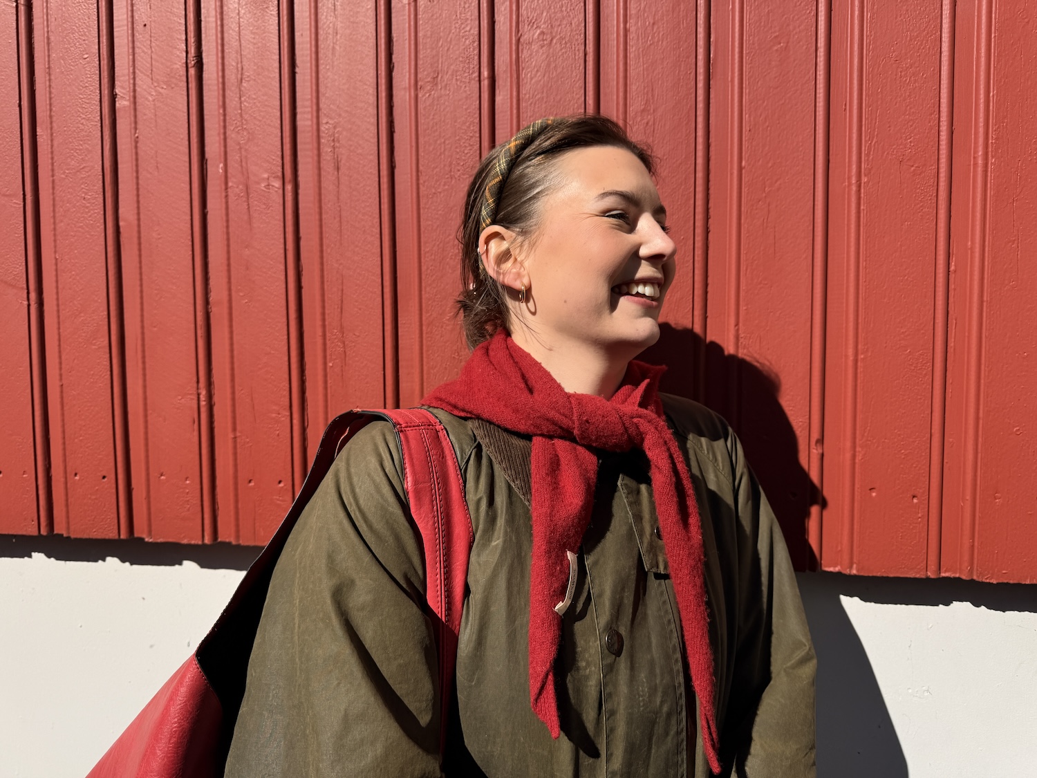 Ved det ytterste bordet, akkurat der solstripen treffer treverket, sitter en jente og venter. Hun speider utover med et forventningsfullt blikk. Rundt halsen har hun et signalrødt skjerf. Ved stolbenet står en matchende rød veske. Når jeg kommer bort, bryter hun raskt ut i et smil og introduserer seg selv: