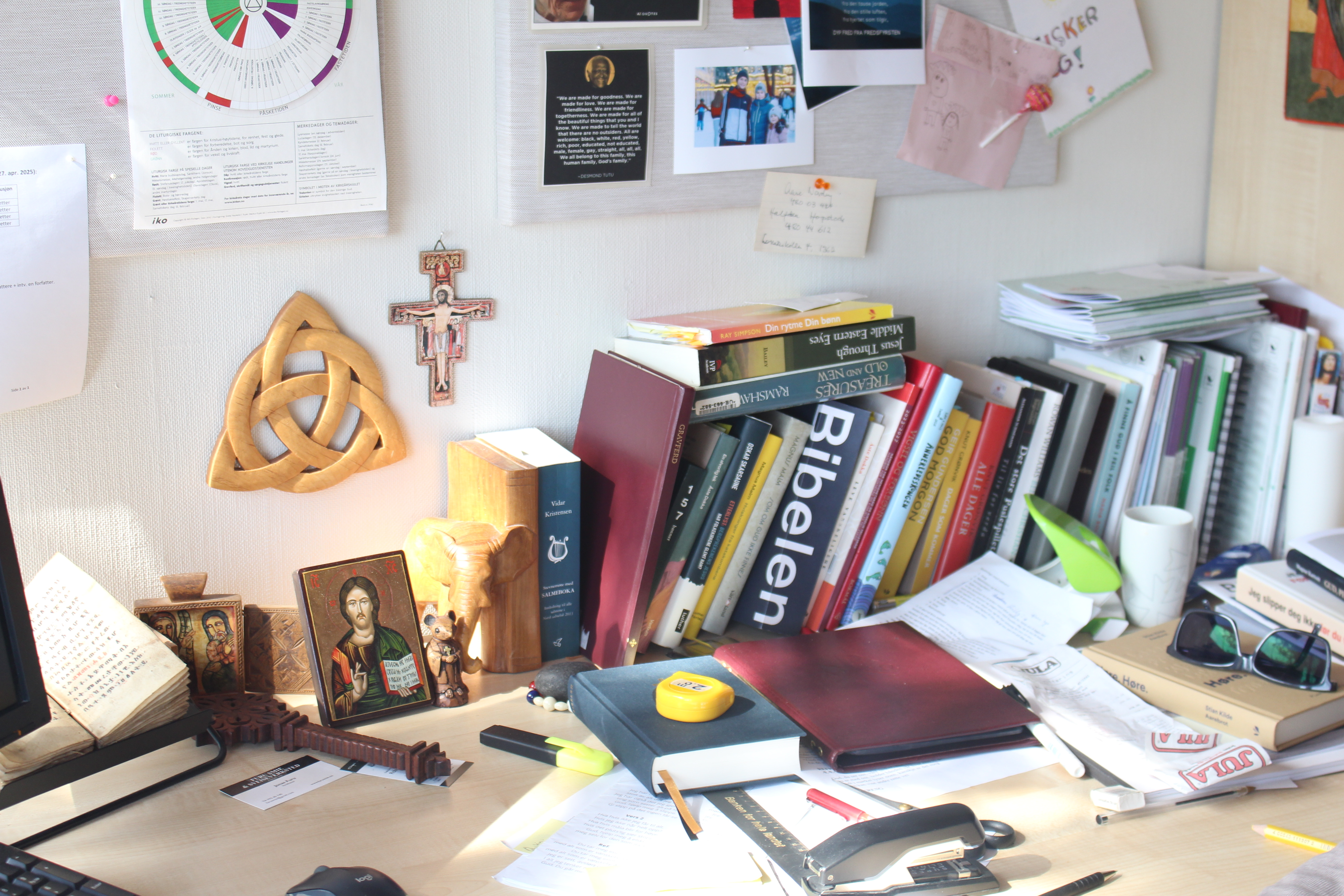 Menighetskontoret var akkurat sånn man så det for seg. Et klassisk bygg fra 80-tallet der det så ut som hver minste lille gjenstand hadde stått på samme plass i 40 år. Hyllene på Engs kontor var fylt opp av det som så ut til å være liturgiske bøker.