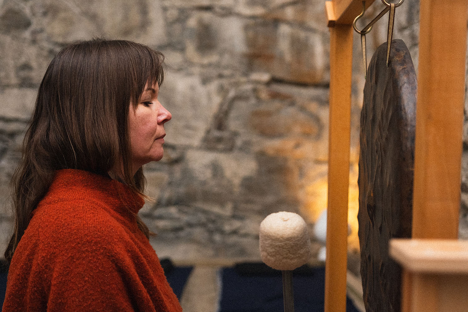 Therese Aasvik er utdannet yogalærer, gong master og lydhealer. Hun arrangerer gongbad, som sies at kan være stressreduserende og føre til dyp avspenning.