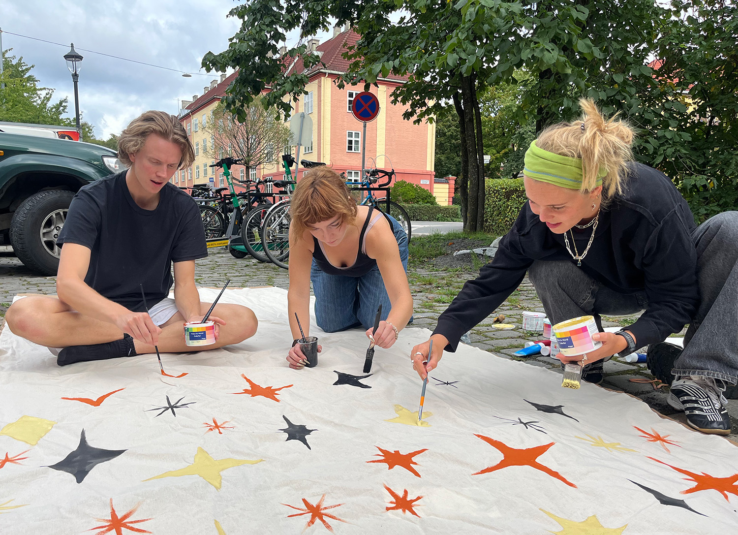 På den kalde brosteinen ligger en lang hvit duk som skal males. Det skal være noe munkeaktig. Det er alt de vet.