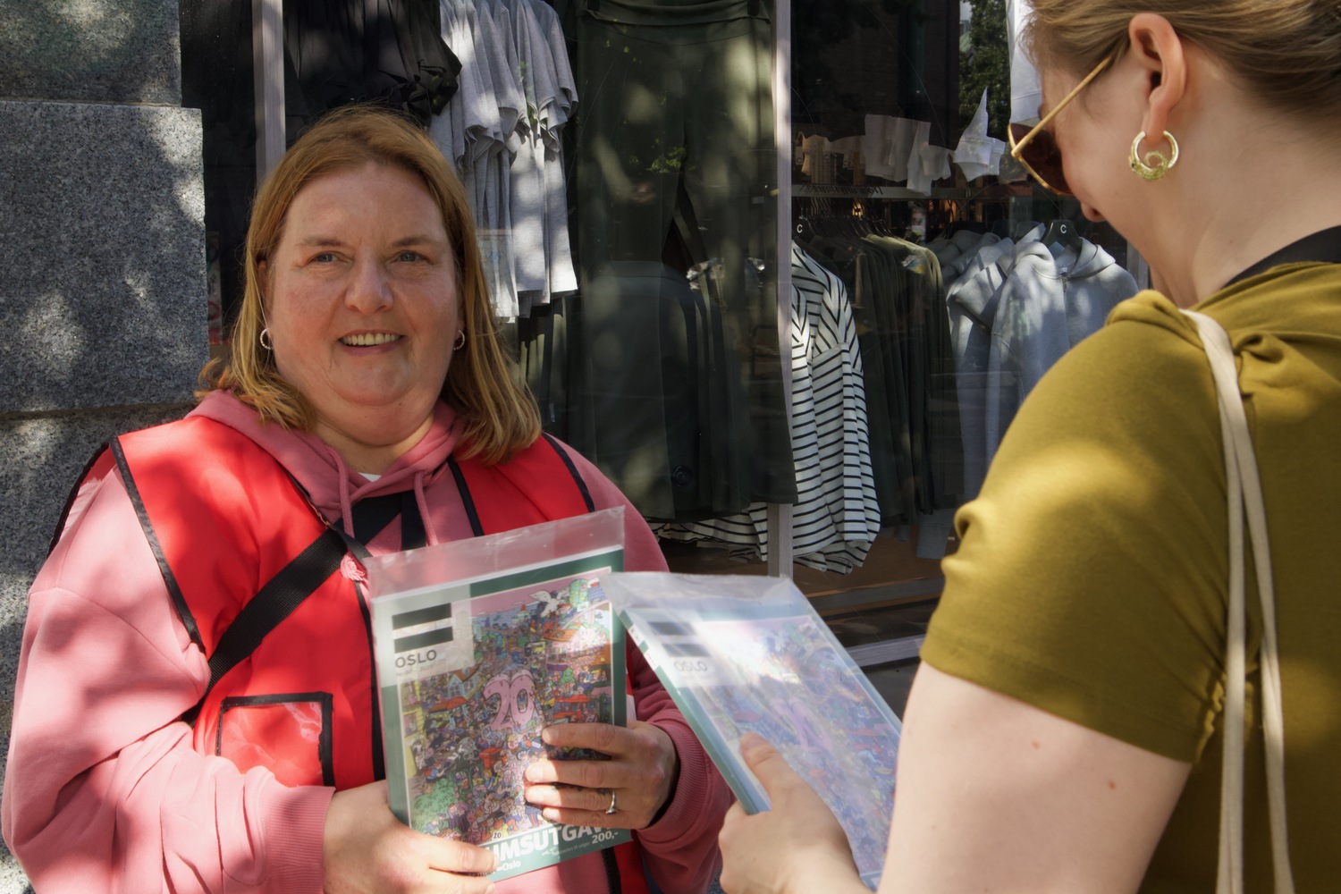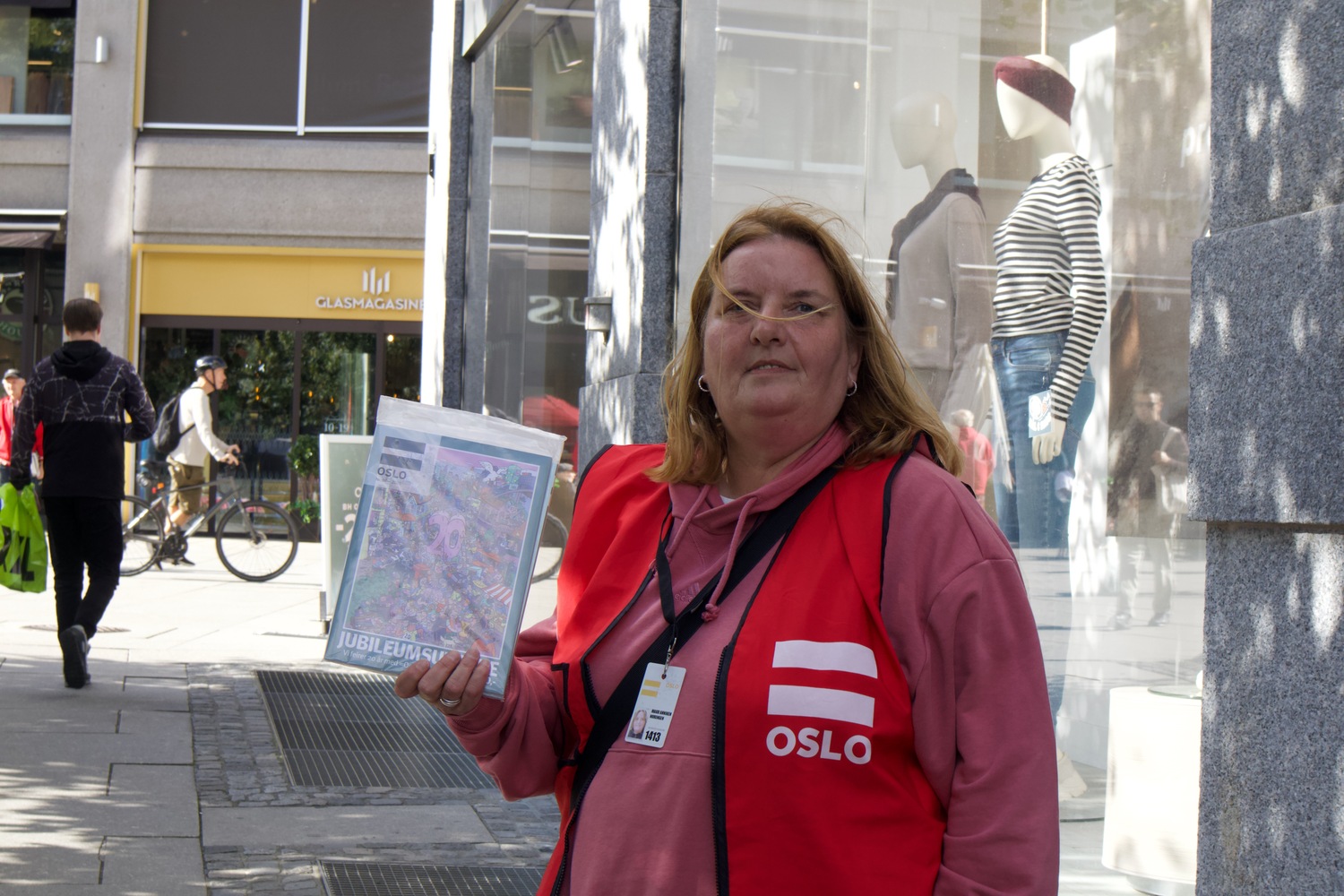 Med rød vest og et jubileumsblad i hånden spør hun alle som går forbi «Hei, vil du kjøpe =OSLO?».