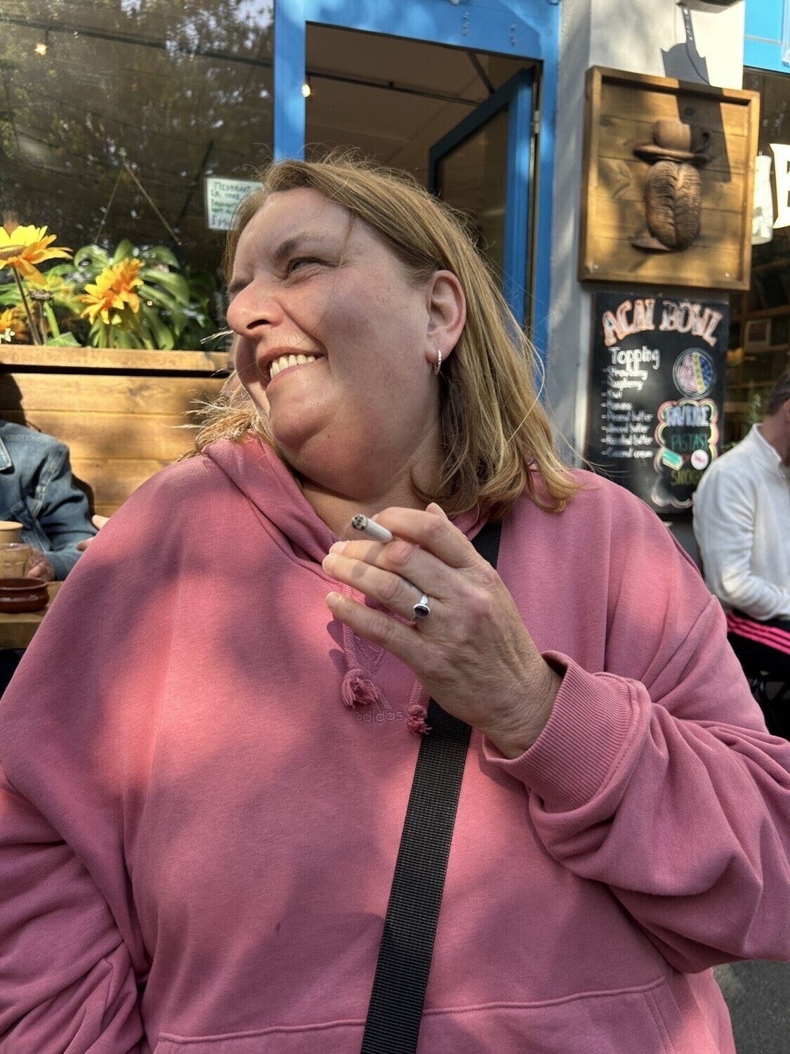 Før hun skal starte med dagens salg, går Anniken til favorittcafeen som ligger like rundt hjørnet. Her kan hun lene seg tilbake, observere de mange menneskene som sprader forbi – og ta seg enda en røyk.