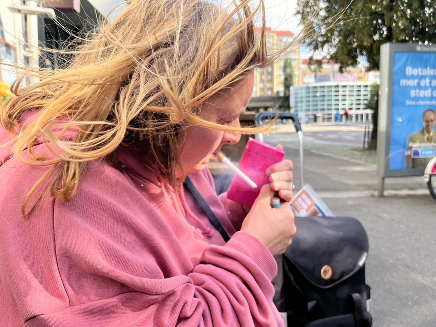 Hun skjermer flammen fra lighteren med håndflaten og trekker pusten dypt. Vinden river godt mellom bygningene i Oslo sentrum, og etter et par forsøk får hun endelig fyr på sigaretten.