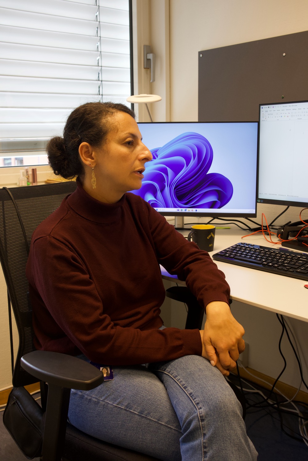 På kontoret sitt ved Arbeidsforskningsinstituttet på OsloMet, sitter Talieh Sadeghi. Beina er lagt i kryss og hendene danser i luften mens hun forteller om arbeidsinkludering.