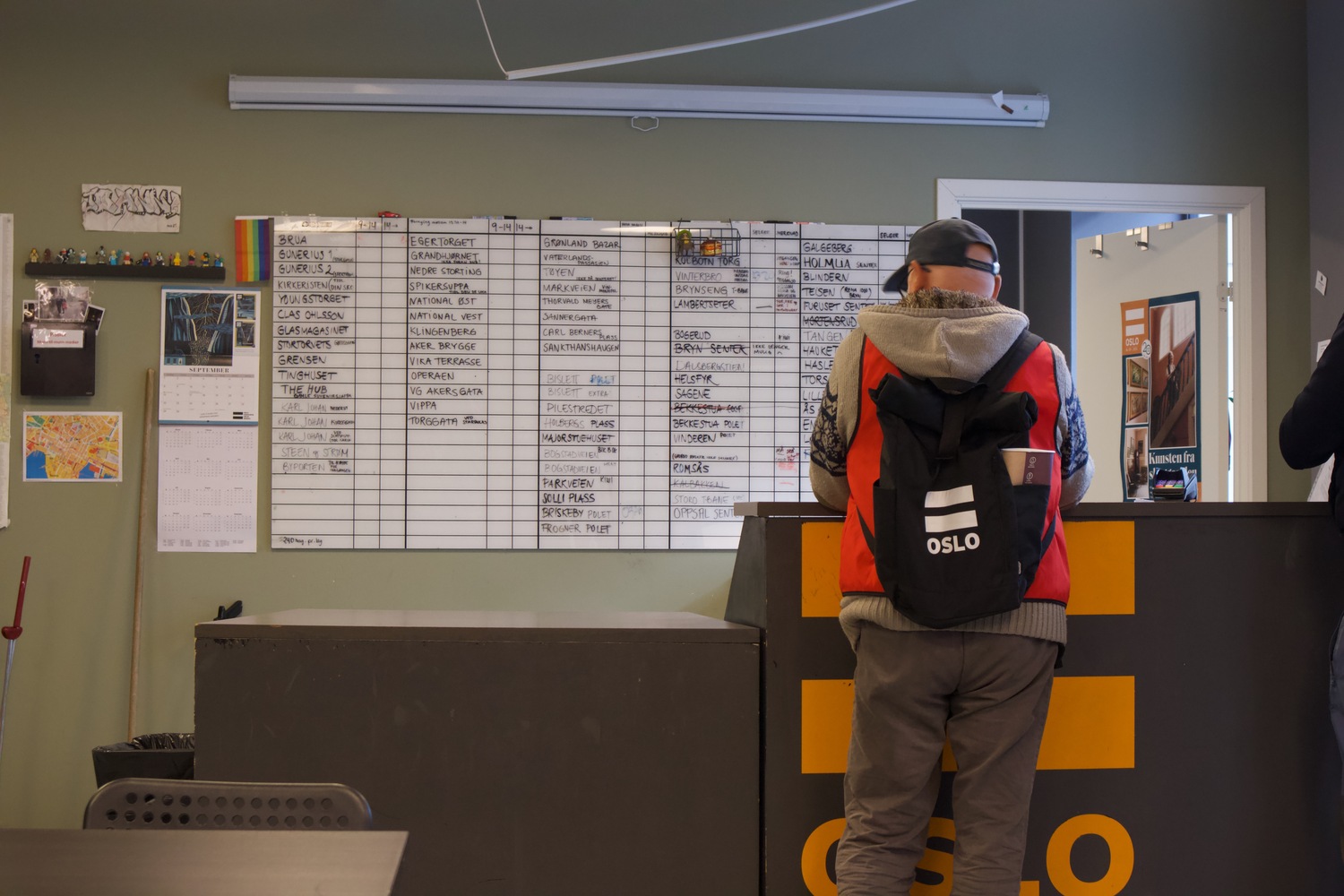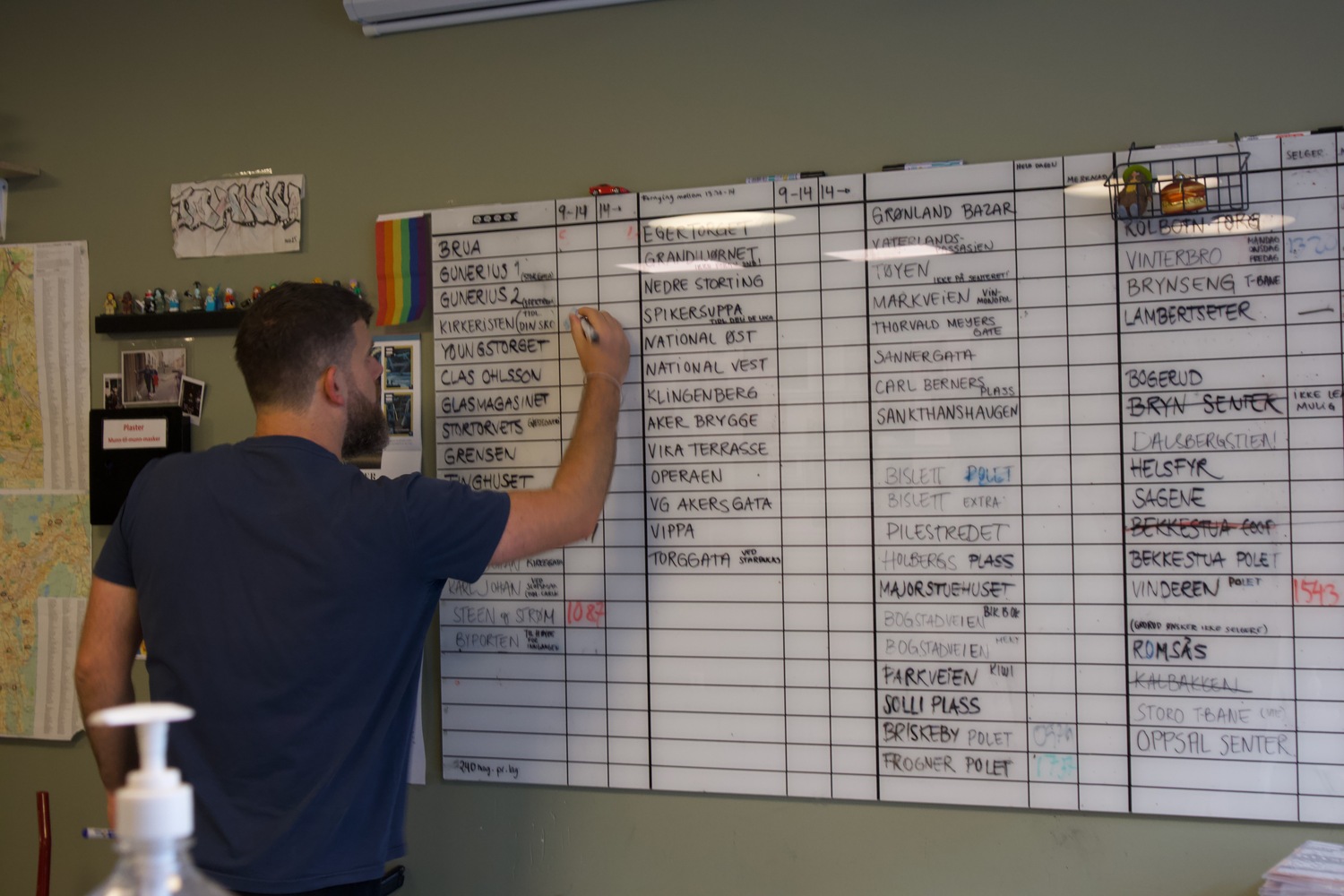 Anniken kaster et blikk mot klokken som henger på veggen, den viser 14.00. Henrik, miljøarbeideren, trenger ikke spørre henne hvor hun vil selge i dag. På tavlen henger en liste over ulike selgerplasser. Med blå tusj skriver han opp Annikens nummer, 1413. Favorittplassen er sikret.
