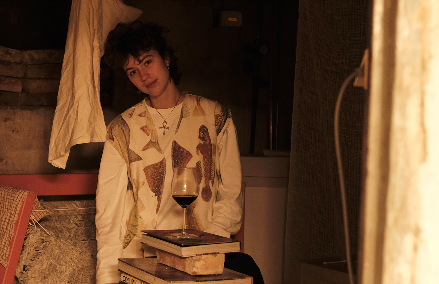 – Rødvinsalkoholisme er jo ekstra synlig. Man blir sløv, med røde øyne og rødvinsfarge som setter seg i leppene. Det er det som er hensikten med videoverket, å illustrere hvor visuelt rusen setter seg, som påvirker både den det gjelder og menneskene rundt.