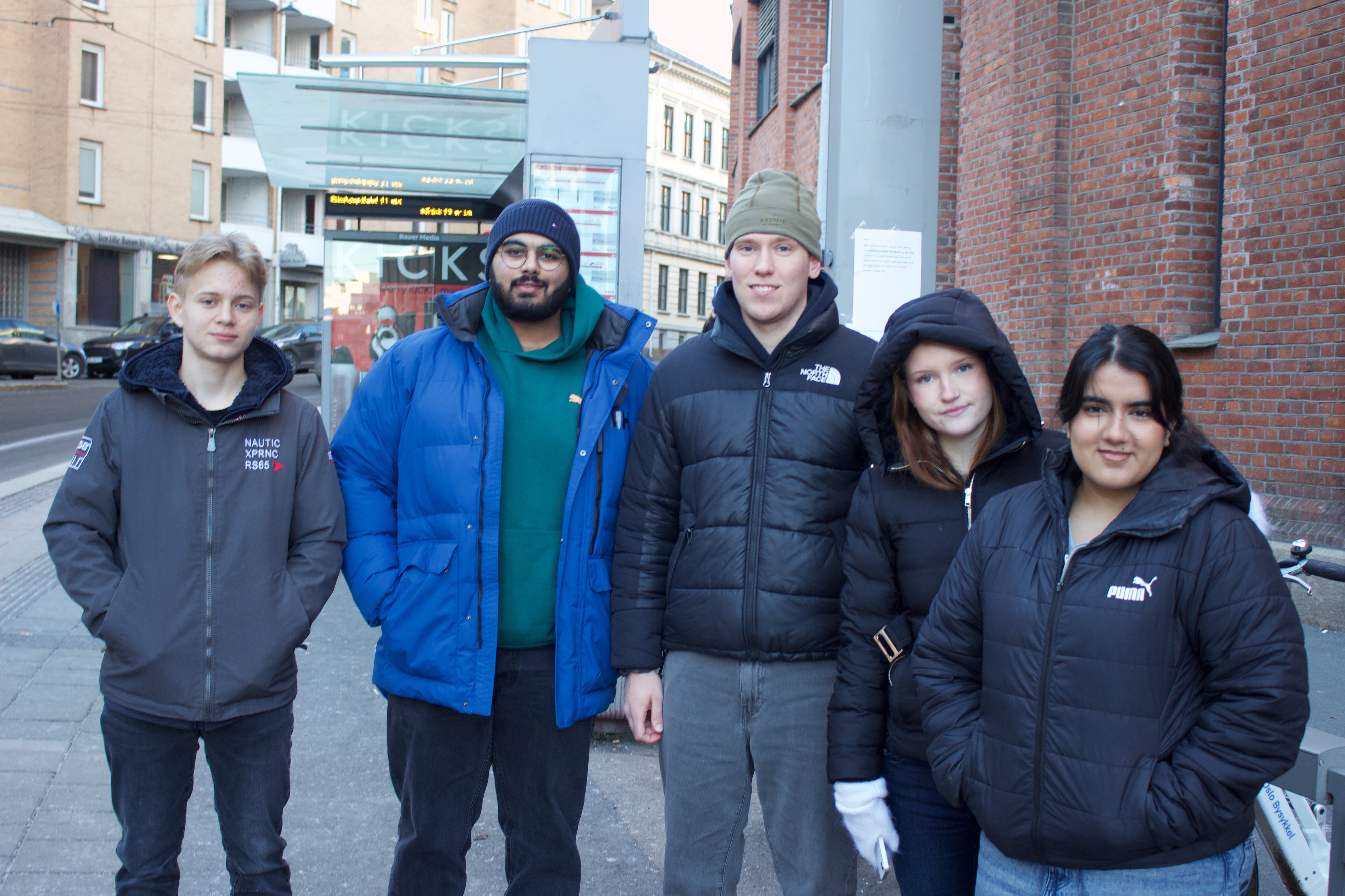 Vennegjengen Tuva (17), Rumandip (19), Arvid (22), Haakon (18), og Asis (18) er elever på Akademiet videregående skole Bislett.