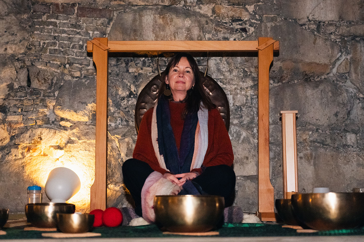 Lydbadpraktikeren lister seg forsiktig rundt rommet, mens hun slår på ulike boller som gir tilbake en sterk, vibrerende lydeffekt. Hun setter seg ned med beina i kryss.