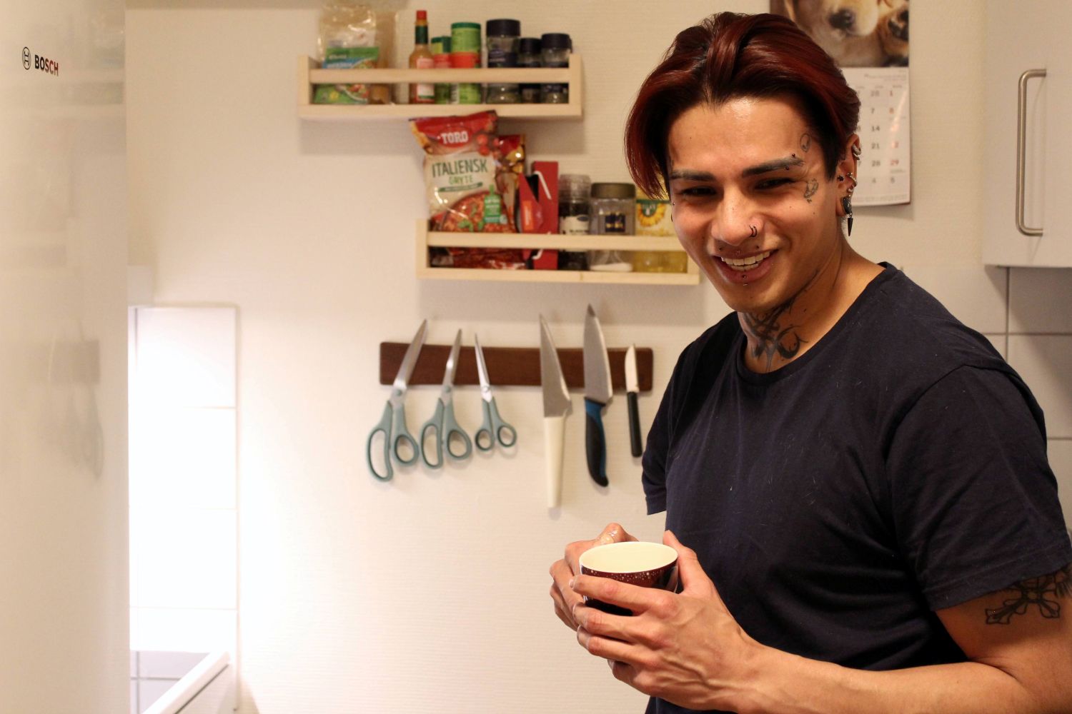 En logrende tynn skikkelse møter meg i døren på Alexander Kjellands plass. Hunden Camalote er av rasen spansk mynde, og vil gjerne hilse. Den smale kroppsbygningen og de søte øynene gjør at den relativt store hunden ikke virker så truende. Diego er dekket i tatoveringer som klatrer oppover halsen og ut i ansiktet. De mange piercingene glitrer i det skarpe lyset som trenger gjennom vinduene i leiligheten. Ved første øyekast kan stilvalget virke truende, men litt som med hunden hans gjør den varme utstrålingen at han virker langt fra skummel.