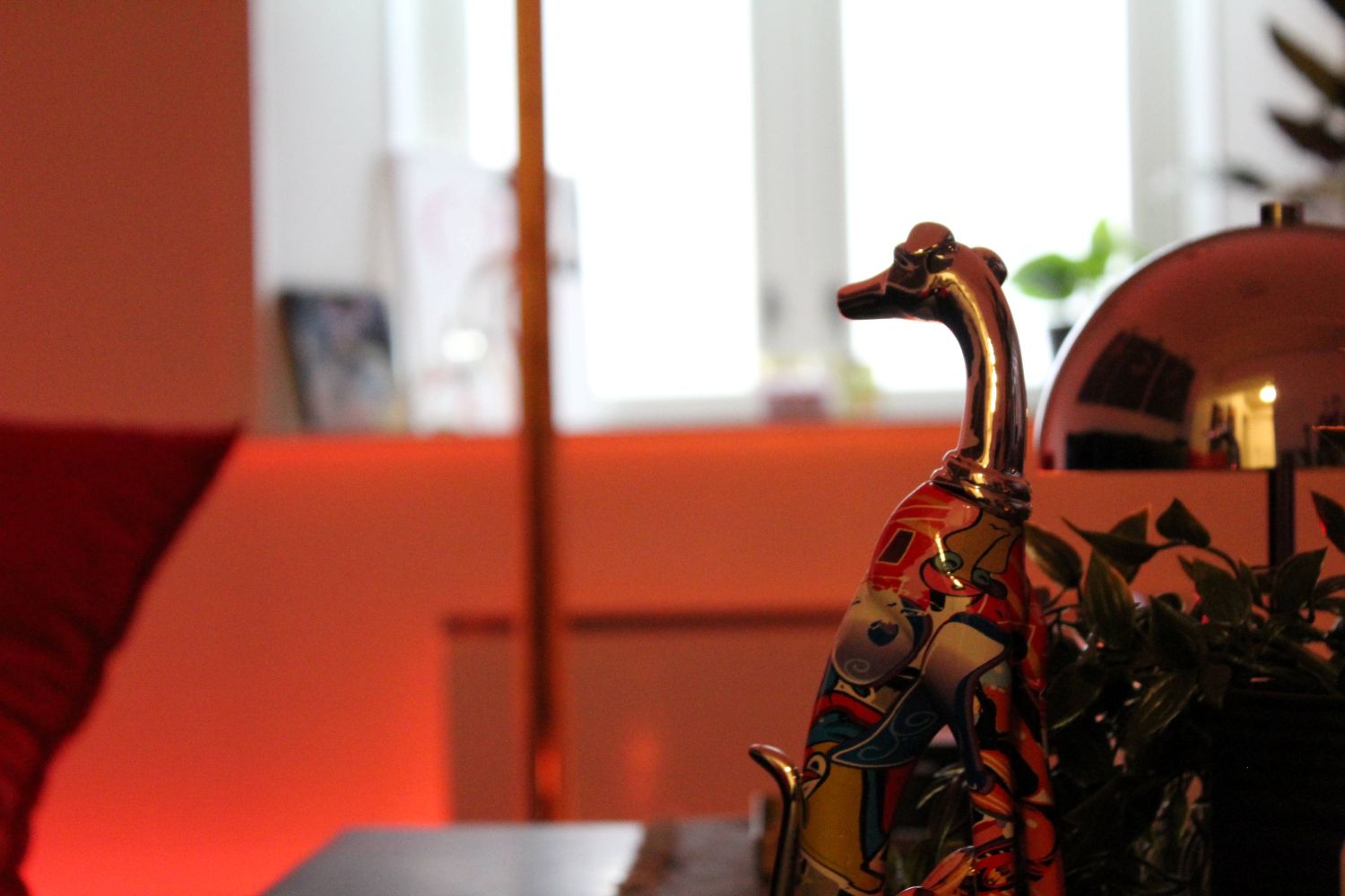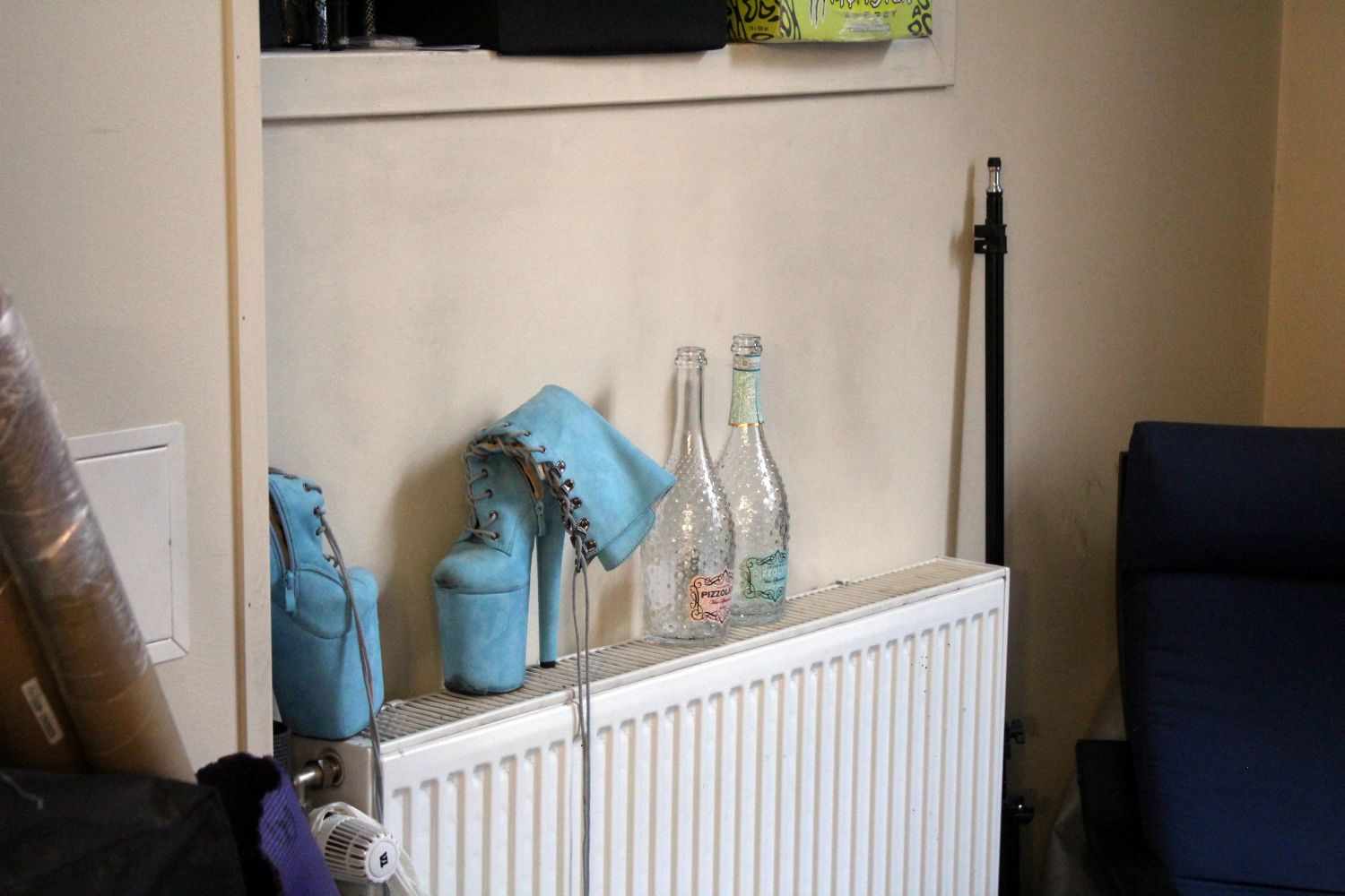 Inne i stua står selve midtpunktet – en gullfarget stang som strekker seg fra gulvet og opp i taket. Langs listene gløder røde LED-striper som gir rommet en mørk og varm tone, til tross for at vårsola skinner utenfor. I en hylle i hjørnet står fargerike hæler på rekke og rad, og ved siden av har Diego pyntet med medaljer. «1st Place Exotic Poledance Championship 2024» står det på en av dem. Diego gir meg en kopp kaffe og lager en til seg selv før vi setter oss ned i den svarte skinnsofaen.