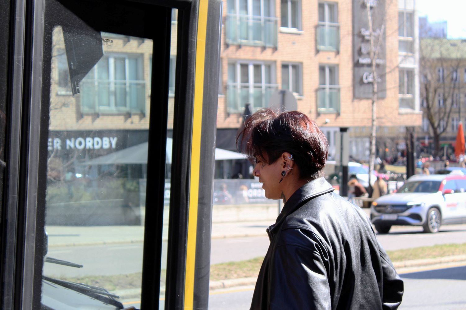 Jeg følger Diego bort til bussholdeplassen på Alexander Kjellands plass. Han virker relativt rolig for en som skal på jobbintervju. 54 Kværnerbyen kjører saktere før den stopper opp foran oss.