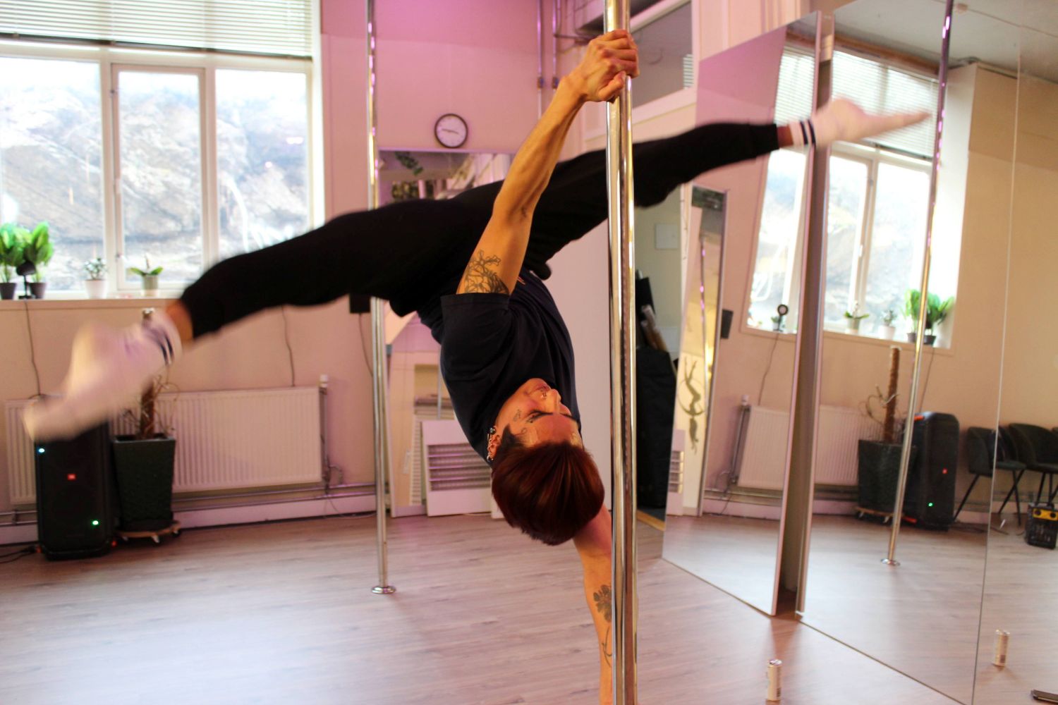 Vi setter oss på bussen til Etterstad. Midt blant gamle industribygg ligger dansestudioet, North Pole, der han underviser et par ganger i uka. Han skal ha en dobbeltime denne dagen. Studioet er som andre dansesaler, store speil og parkett på gulvet, men her er det i tillegg satt opp polestenger. Lageret er fylt opp av diverse ting, hæler i ulike fasonger og farger, klær, gjennomsiktige plastbokser med ting, noen stoler og et par tomme proseccoflasker.